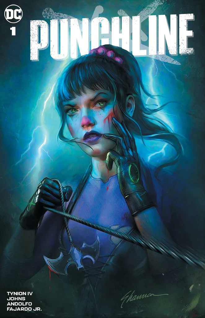 Comic Mint exclusive variant by Shannon Maer. Written by James Tynion TV and Sam Johns. Art by Mirka Andolfo. Spinning out of the pages of The Joker War comes the first solo book starring the blockbuster new character Punchline. As she faces the consequences for her role in The Joker War, the story of how Alexis Kaye became Punchline will take Leslie Thompkins, Harper Row, and Cullen Row on a harrowing journey that reveals a fringe teenagers radicalization to the ideology of a madman. Its a terrifying tale so big it demanded an oversize special issue! 48 pages, full color. Rated T+