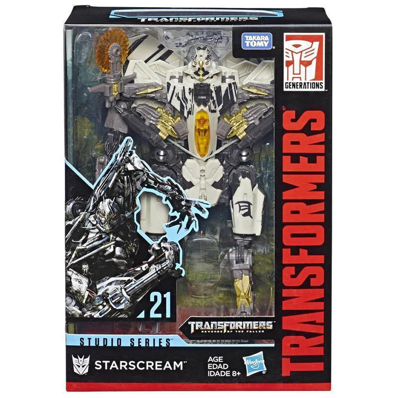 Includes Transformers Studio Series 21 Voyager Class Movie 2 Starscream figure, detailed weapon accessory, removable backdrop, and instructions.
